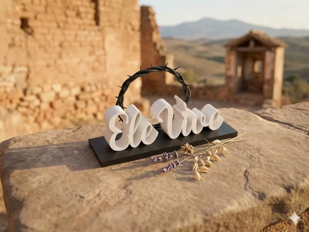 Contraste Elegante: A base e a coroa em preto destacam a mensagem “Ele Vive” em branco, criando um ponto focal de respeito e beleza.