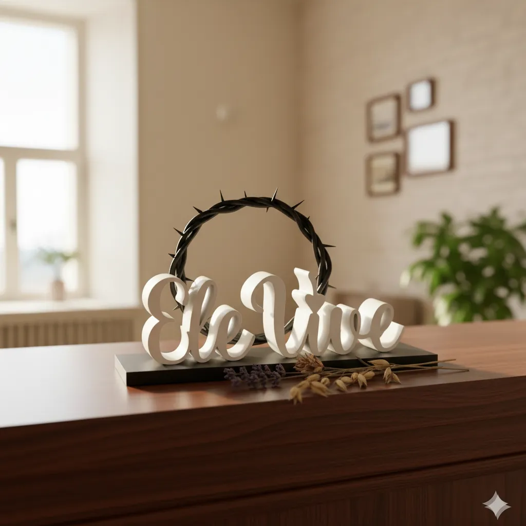 Eleve a decoração do seu ambiente com uma peça que une sofisticação moderna e um profundo significado espiritual. Esta versão exclusiva da escultura “Ele Vive” apresenta um contraste marcante entre o preto absoluto e o branco puro, ideal para decorações contemporâneas, minimalistas e industriais.